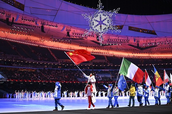 在“中國(guó)結(jié)”的映襯下,各代表團(tuán)運(yùn)動(dòng)員入場(chǎng),谷愛(ài)凌開(kāi)心到蹦蹦跳跳,徐夢(mèng)桃坐在高亭宇的肩膀上,成為全場(chǎng)“最高”的旗手……全場(chǎng)觀眾用掌聲和歡呼聲,向體育健兒們表達(dá)熱烈的祝賀和由衷的敬意,“鳥(niǎo)巢”成為一片歡樂(lè)的海洋。現(xiàn)場(chǎng)大屏幕播放短片《2022,有我!》,再現(xiàn)了運(yùn)動(dòng)員們奮勇拼搏、激情飛揚(yáng)的精彩瞬間。