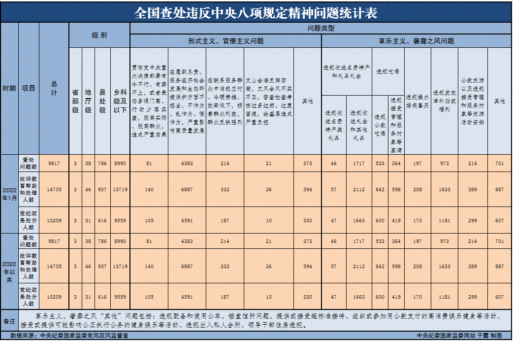 2月25日,中央紀委國家監委公布了2022年1月全國查處違反中央八項規定精神問題匯總情況。當月,全國共查處違反中央八項規定精神問題9817起,批評教育幫助和處理14705人,其中黨紀政務處分10209人。這是中央紀委國家監委連續第101個月公布月報數據。