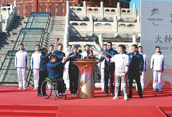 3月2日,北京2022年冬殘奧會火種匯集儀式在天壇公園舉行。圖為殘疾人運動員、殘聯等各界人士代表手持采火棒登上主席臺,用取自九個點位的火種共同點燃儀式火種臺。 新華社記者 丁林 攝