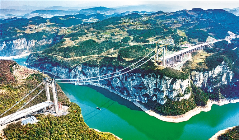 金烽烏江大橋是貴陽經金沙至古藺(貴金古)高速公路項目的重要控制性工程,橋梁全長1473.5米,預計年底建成通車。圖為3月9日拍攝的貴金古高速金烽烏江大橋。新華社記者 陶亮 攝