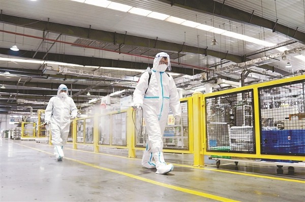 圖為近日,上汽集團在做好疫情防控的前提下,旗下整車、零部件和物流企業圍繞人員保障、供應鏈保障、物流保障、封閉生產管理和防疫措施等環節啟動了復工復產壓力測試。 (圖片來源:人民視覺)