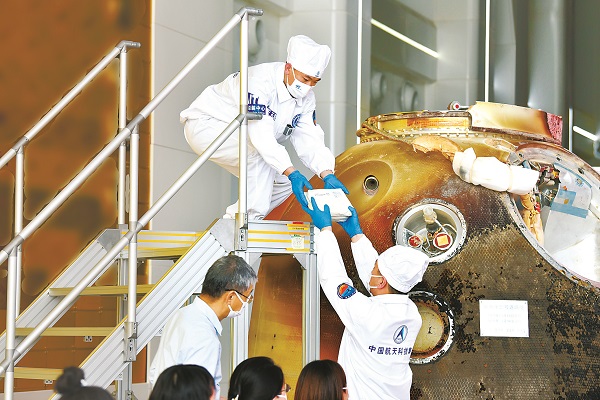 近日,神舟十三號載人飛船返回艙在京完成開艙,工作人員開艙取出包括作物種子在內的搭載物品。 (中國載人航天工程辦公室供圖)