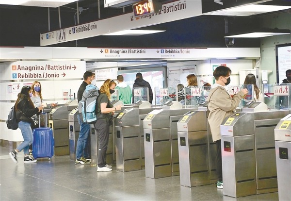 針對疫情形勢,意大利將室內強制口罩令延長至6月15日,民眾進入醫院、療養院等場所以及乘坐公共交通工具時仍需佩戴口罩。圖為近日,羅馬市民在通過地鐵站檢票口。 新華社記者 金馬夢妮 攝