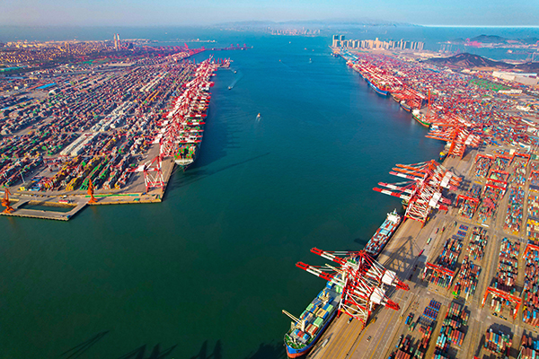 今年一季度,我國(guó)外貿(mào)進(jìn)出口總值9.42萬(wàn)億元人民幣,同比增長(zhǎng)10.7%,連續(xù)7個(gè)季度保持正增長(zhǎng)。圖為4月23日,青島前灣港集裝箱碼頭一派繁忙景象。 (圖片來源:視覺中國(guó))