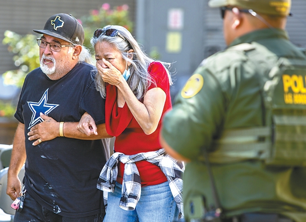 美國得克薩斯州州長阿伯特24日說,得克薩斯州南部尤瓦爾迪市一所小學當天發生槍擊事件。據報道,該案死亡人數升至21人。圖為當地驚魂未定的人們。新華社發