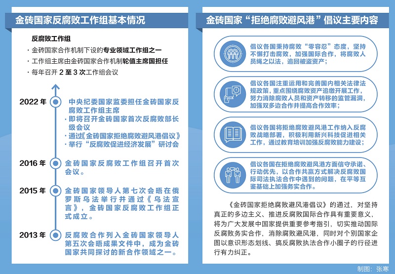 反腐敗工作組是金磚國家合作機(jī)制下設(shè)的專業(yè)領(lǐng)域工作組之一,每年召開2至3次工作組會議。中央紀(jì)委國家監(jiān)委代表中方參與金磚國家反腐敗合作,積極推動(dòng)金磚國家在拒絕腐敗避風(fēng)港、反腐敗追逃追贓等領(lǐng)域開展合作。