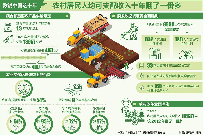 數說中國這十年丨農村居民人均可支配收入十年翻了一番多