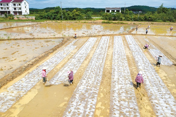 江西省撫州市金溪縣采取多種措施,全力推進耕地“非農化”“非糧化”整治。圖為7月7日,在該縣陸坊鄉萬花道田園綜合體,農民正在加緊清理耕地上的非糧作物,準備重新種植水稻。 (圖片來源:人民視覺)