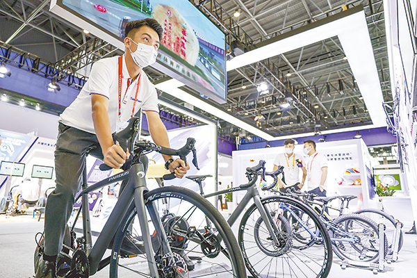 第二屆中國國際消費品博覽會匯聚了來自國內外2800余個參展品牌,眾多“高、新、特、優”產品集中亮相,備受消費者青睞。圖為7月26日,參展商在消博會現場演示自行車產品。 新華社記者 張麗蕓 攝