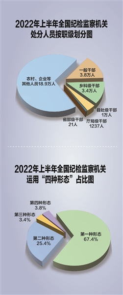 7月19日,中央紀(jì)委國家監(jiān)委通報2022年上半年全國紀(jì)檢監(jiān)察機關(guān)監(jiān)督檢查審查調(diào)查情況。2022年上半年,全國紀(jì)檢監(jiān)察機關(guān)共處分省部級干部21人,廳局級干部1237人,縣處級干部1萬人,運用“四種形態(tài)”批評教育幫助和處理共85.5萬人次。數(shù)據(jù)背后,體現(xiàn)著始終堅持嚴(yán)的主基調(diào)不動搖,保持反對和懲治腐敗的強大力量常在。