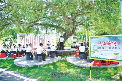 為建設(shè)“清廉???rdquo;,海南省海口市紀(jì)委監(jiān)委發(fā)揮黨建引領(lǐng)作用,把紅色文化與廉潔文化相融合,大力推進廉潔文化建設(shè)。圖為該市龍華區(qū)黨員干部在東譚村基層黨風(fēng)廉政建設(shè)教育基地的大榕樹下聆聽黨課。王咸山 攝