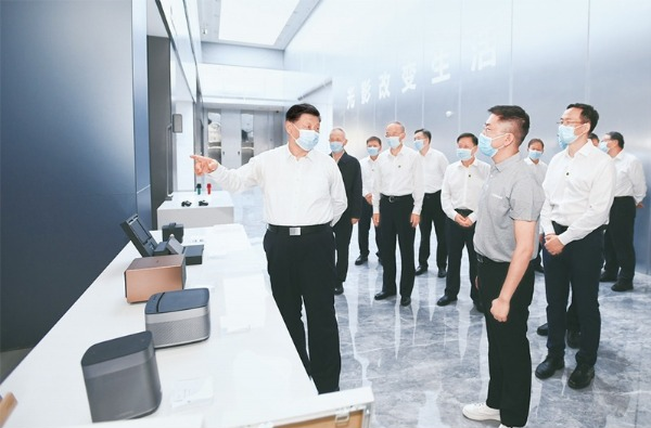2022年6月8日,中共中央總書記、國家主席、中央軍委主席習近平在四川考察。這是8日下午,習近平在宜賓市極米光電有限公司考察,了解企業自主創新和產品研發銷售情況。 新華社記者 謝環馳/攝