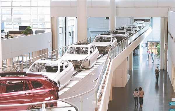 2022年初,我國放開乘用車制造外資股比限制后,德國寶馬集團通過增資279億元人民幣的方式,將其在華晨寶馬的股權占比由50%提升至75%,并將與華晨的合作期延長至2040年。圖為華晨寶馬沈陽鐵西工廠,生產中的車輛正在穿過辦公區。新華社記者 楊青 攝