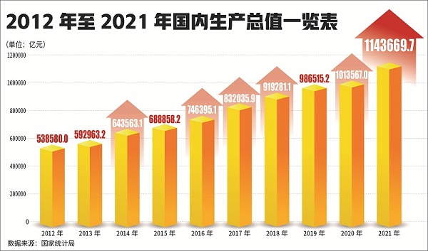 53.9萬億元,這是2012年我國的經(jīng)濟(jì)總量。此后,中國經(jīng)濟(jì)連上六個10萬億元級臺階,到2021年達(dá)到114.4萬億元,穩(wěn)居全球第二。黨的十八大以來,在新發(fā)展理念引領(lǐng)下,中國經(jīng)濟(jì)爬坡過坎、攻堅克難,既保持了量的合理增長,也實現(xiàn)了質(zhì)的穩(wěn)步提升。