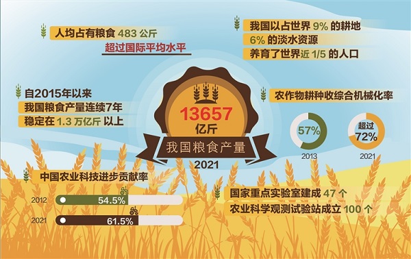 民為國基,谷為民命。“中國人要把飯碗端在自己手里,而且要裝自己的糧食。”黨的十八大以來,我國確立了以我為主、立足國內(nèi)、確保產(chǎn)能、適度進(jìn)口、科技支撐的國家糧食安全戰(zhàn)略,堅(jiān)持耕良田、育良種、用良技,糧食產(chǎn)量連續(xù)7年穩(wěn)定在1.3萬億斤以上,十年再上一個(gè)千億斤新臺(tái)階,人均占有糧食達(dá)到483公斤,超過國際平均水平。