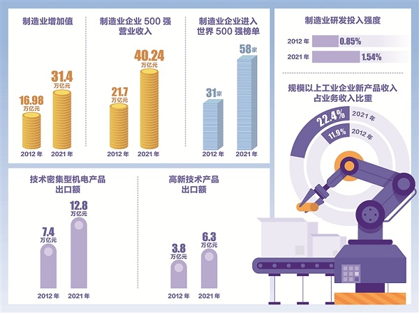 據統計,2012年至2021年,我國制造業增加值從16.98萬億元增長到31.4萬億元,占全球比重從22.5%提高到近30%。在世界500種主要工業產品中,我國有四成以上產品產量位居世界第一。中國制造業企業500強營業收入從2012年的21.7萬億元增長到2021年的40.24萬億元,有58家制造業企業進入2021年世界500強榜單,比2012年增加27家。