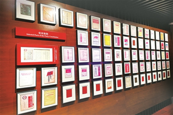 在黨章歷程專題展廳,一面火紅的黨章陳列墻令人眼前一亮。墻上以黨章形成的時(shí)間為序,展出了不同時(shí)期、不同版本的黨章,集中反映了中國(guó)革命、建設(shè)和改革事業(yè)的進(jìn)程。