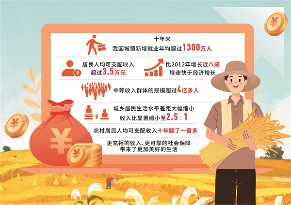 據統計,十年來,我國城鎮新增就業年均超過1300萬人,居民人均可支配收入超過3.5萬元,比2012年增長近八成,增速快于經濟增長,中等收入群體的規模超過4億多人。城鄉居民生活水平差距大幅縮小,收入比顯著縮小至2.5∶1,農村居民人均可支配收入十年翻了一番多。更充裕的收入、更可靠的社會保障,帶來了更加美好的生活。
