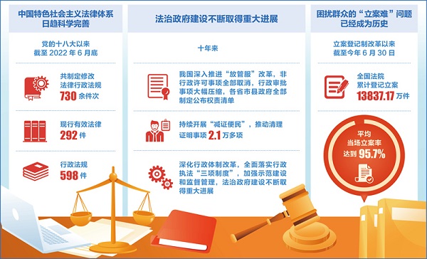 良法是善治之前提。十年來,我國加快建設中國特色社會主義法律體系。從全面加強憲法實施和監督到編纂民法典,從制定香港特別行政區維護國家安全法到修改完善香港選舉制度,再到生態環境、教育科技等重要領域法律全面修訂,網絡信息、生物安全等新興領域立法取得突破,國內法治和涉外法治統籌推進……截至2022年6月底,共制定修改法律行政法規730余件次,現行有效法律292件,行政法規598件,中國特色社會主義法律體系日趨科學完善。