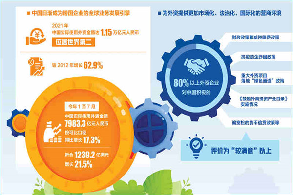 據統計,中國2021年實際使用外資金額達1.15萬億元人民幣,位居世界第二,較2012年增長62.9%。與此同時,全球外國直接投資僅增長27%。今年1至7月,中國實際使用外資金額7983.3億元人民幣,按可比口徑同比增長17.3%,折合1239.2億美元,增長21.5%。