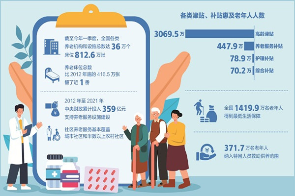 2012年至2021年,中央財政累計投入359億元支持養老服務設施建設,社區養老服務基本覆蓋城市社區和半數以上農村社區,居家社區機構相協調、醫養康養相結合的養老服務體系持續健全。高齡津貼、養老服務補貼、護理補貼、綜合補貼分別惠及3069.5萬、447.9萬、78.9萬、70.2萬老年人。全國1419.9萬名老年人得到最低生活保障,371.7萬名老年人納入特困人員救助供養范圍。