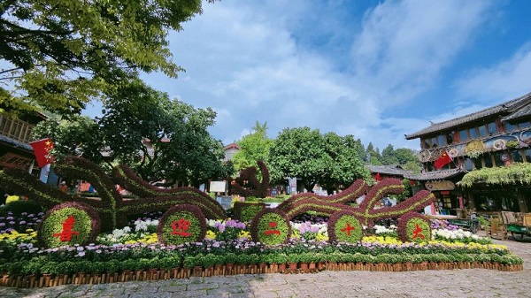 麗江市古城區四方街中的花朵們,共同表達著人們的心聲。(王元春 攝)