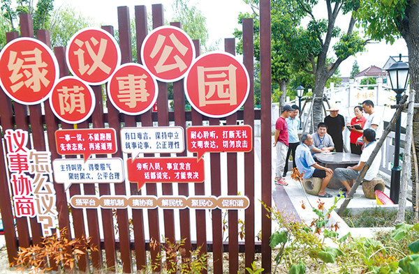 在浙江省長興縣呂山鄉(xiāng)龍溪村的議事公園內(nèi),田園議事會成員開展討論協(xié)商。新華社記者 徐昱 攝