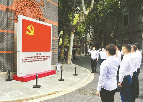 圖為近日,在上海中共一大紀(jì)念館展館外的黃陂南路口,來自基層黨組織的新黨員在黨旗下宣誓,老黨員重溫入黨誓詞。 (圖片來源:人民視覺)