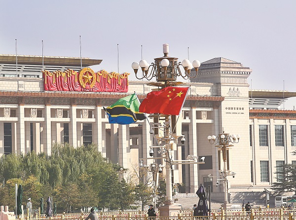 2022年11月3日,北京,天安門廣場懸掛中國和坦桑尼亞兩國國旗,歡迎坦桑尼亞總統哈桑對我國進行國事訪問。哈桑總統是黨的二十大閉幕后首位訪華的非洲國家元首。(圖片來源:視覺中國)