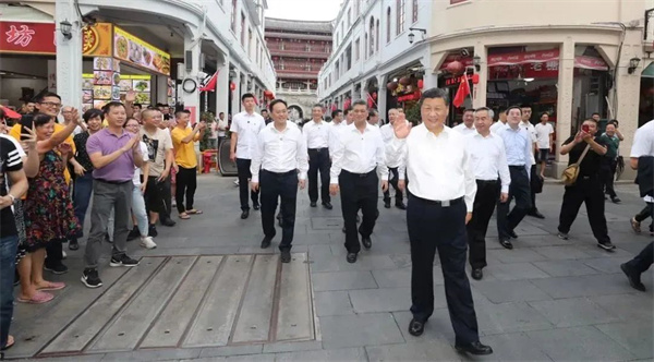 2020年10月12日至13日,習(xí)近平在廣東考察。這是12日下午,習(xí)近平在潮州古城牌坊街考察時,向群眾揮手致意。新華社記者 王曄 攝