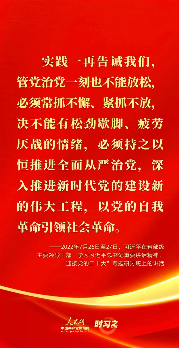 治國必先治黨,治黨務必從嚴。2022年,習近平總書記在多個場合圍繞全面從嚴治黨,闡明思想、作出指示、提出要求。這激勵著廣大黨員干部繼續發揚歷史主動精神,推動全面從嚴治黨乘勢而上、再接再厲;激勵著廣大黨員不忘初心、牢記使命,著力保持平穩健康的經濟環境、國泰民安的社會環境、風清氣正的政治環境,確保黨和國家事業行穩致遠。