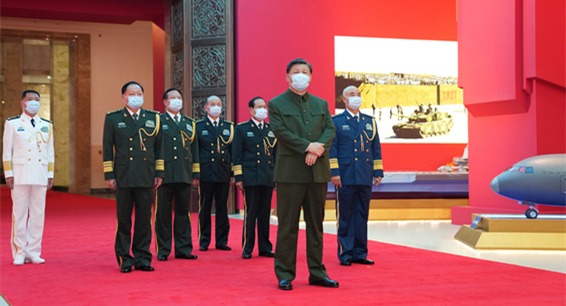 下午4時30分許,習近平來到中國人民革命軍事博物館,步入展廳參觀展覽。展覽聚焦以習近平同志為核心的黨中央領導國防和軍隊建設的偉大實踐,安排8個單元展區,設置“黨在新時代的強軍目標”、“重整行裝再出發”、“礪劍鑄盾 奔向一流”、“大好河山 寸土不讓”、“愛我人民愛我軍”、“深情勵三軍 奮進新征程”等重點展項,通過1400余件文物實物、630余張照片、近百套武器裝備模型以及大量圖表、視頻、藝術作品、互動項目等,生動展示了新時代國防和軍隊建設的壯闊歷程和偉大成就,充分展現了人民軍隊忠誠維護核心、矢志奮斗強軍的昂揚風貌。習近平不時駐足觀看,認真聽取講解,詢問有關情況。
