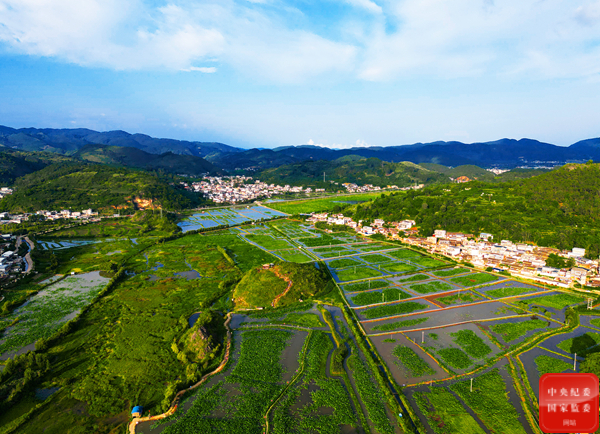 盛夏七月,云南省施甸縣姚關(guān)鎮(zhèn)的野鴨湖恢復(fù)濕地形成千畝荷塘,碧翠盡染,宛如一塊巨大的綠色地毯,與藍(lán)天白云下靜謐的村莊相互襯托,呈現(xiàn)出一幅綠水青山、生態(tài)宜居的夏日美麗鄉(xiāng)村畫卷。(云南省保山市施甸縣紀(jì)委監(jiān)委 吳明鳳 攝)