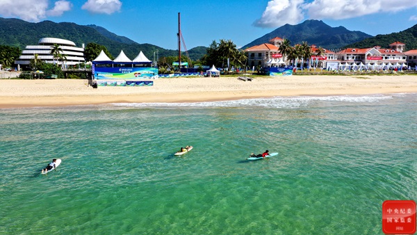 七月,在海南省萬寧市日月灣的沖浪小鎮(zhèn),有游客來到這里學(xué)習(xí)沖浪,在海天之間縱享運(yùn)動(dòng)樂趣。圖為沖浪比賽參賽者在賽前熟悉海域、提前熱身。(海南省萬寧市紀(jì)委監(jiān)委 汪小丹 攝)