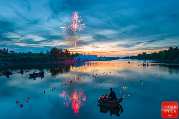 微風(fēng)輕拂下,小船悠悠拂起碧波粼粼,河燈遠(yuǎn)曳載上美好祝愿,煙花陣陣綻放流光溢彩,構(gòu)成了夏日傍晚的美麗風(fēng)光。(安徽省宣城市宣州區(qū)紀(jì)委監(jiān)委供 熊繹 攝)