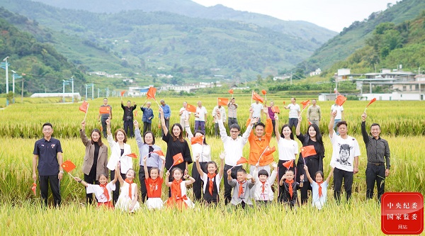 國慶長假遇見金秋豐收美景,四川省鹽邊縣以青山為背景、稻田為舞臺,舉辦“惠民稻田音樂節”,用歌聲傳遞豐收的喜悅、祝福祖國繁榮昌盛。(四川省攀枝花市鹽邊縣紀委監委供 陳普新 攝)