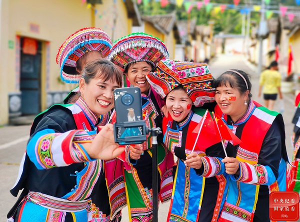 云南省龍陵縣平達鄉組織開展“與國同慶•民族團結”拍攝活動。圖為傈僳族群眾表達著少數民族同胞對祖國的熱愛和祝福。(云南省龍陵縣紀委監委供 王龍芹 攝)