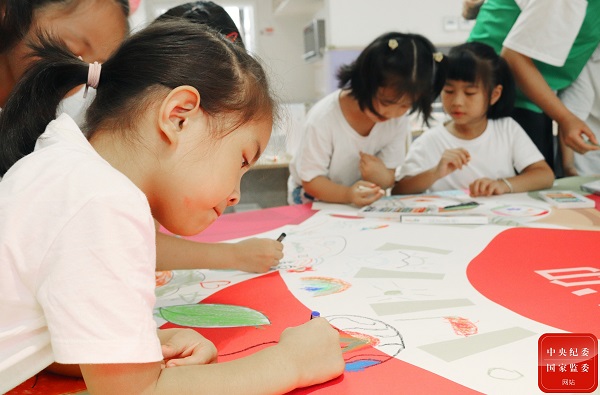 在杭州市錢塘區白楊街道云濱社區,幼兒園小朋友們在大學生志愿者的帶領下一起“畫國慶”,為祖國母親獻上生日祝福。(杭州市錢塘區紀委監委供 屠云彪 攝)