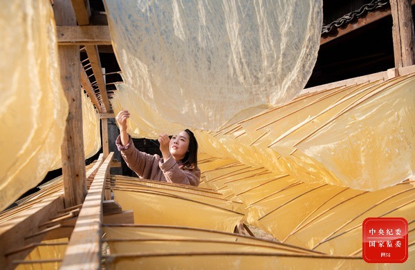 進入立冬節氣,浙江省寧海縣前童古鎮迎來制作豆腐皮的旺季。沸騰豆漿表面泛著的黃色豆皮被挑起,一張張薄如蟬翼的豆腐皮放在竹竿上晾曬,等待自然風干便可進行收納。(浙江省寧海縣紀委監委供 張璐楠 攝)