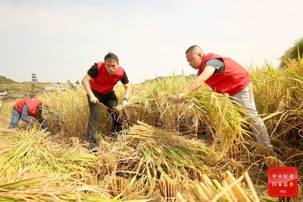貴州省銅仁市玉屏侗族自治縣紀委監委組織志愿服務隊,深入田間地頭,幫助缺乏勞動力的農戶搶收稻谷,解群眾之困,確保秋糧顆粒歸倉。圖為該縣紀委監委志愿服務隊在亞魚鄉郭家灣村幫助村民搶收稻谷。(貴州省玉屏侗族自治縣紀委監委供 劉德軍 攝)