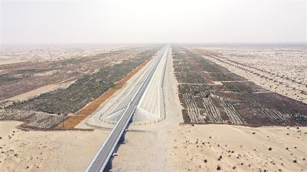 圖為和若鐵路沿線的蘆葦沙障、蘆葦方格和耐旱植物組成的防沙“三件套”。