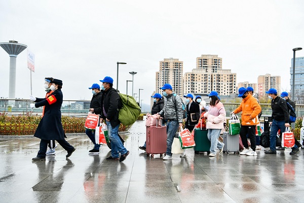 2月8日,600余名務(wù)工人員免費乘坐高鐵,從貴州遵義站前往廣東省返崗務(wù)工。這是貴州省今年開行的首趟返崗務(wù)工動車專列。 新華社記者 楊文斌 攝
