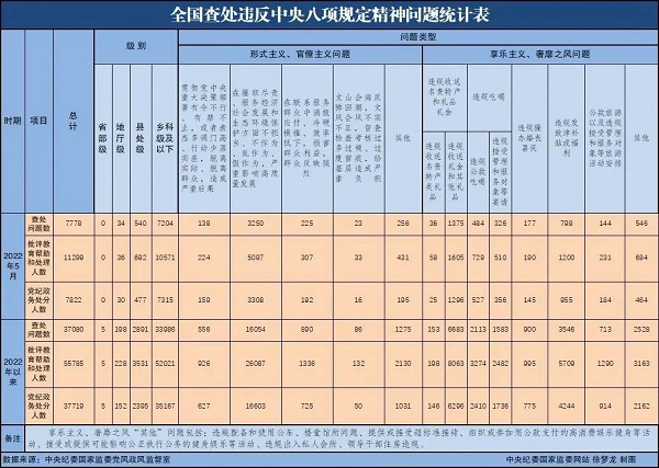 6月27日,中央紀委國家監委公布了2022年5月全國查處違反中央八項規定精神問題匯總情況。當月,全國共查處違反中央八項規定精神問題7778起,批評教育幫助和處理11299人,其中,黨紀政務處分7822人,這是連續第105個月公布月報數據。