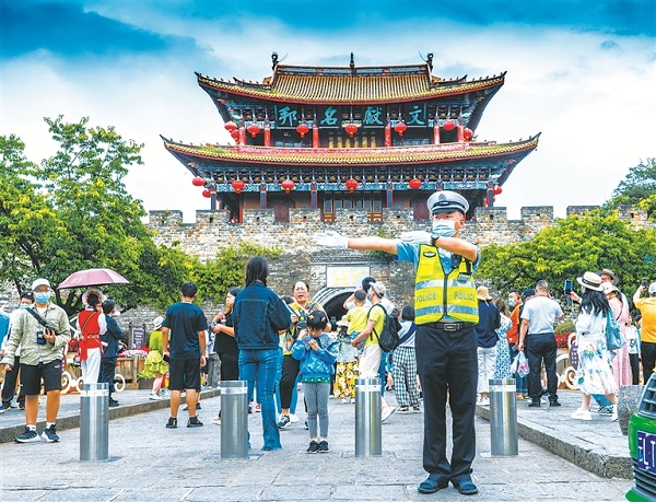 大理州公安局交通警察支隊深入推進以案促改工作,緊盯交警隊伍在服務群眾中存在的問題,進一步規范交警執勤執法行為。圖為大理市執勤交警在大理古城景區定點值守,為群眾營造安全暢通的道路交通環境。趙渝 攝