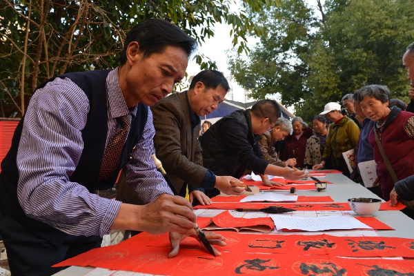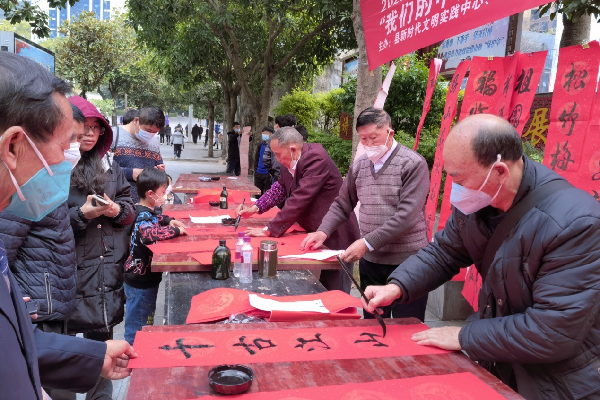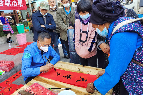 無聯不成春,有聯春更濃。新春將至,丘北縣廣大黨員干部走上廣場,揮毫潑墨書寫廉潔春聯贈予群眾,在傳遞廉潔理念的同時,增加節日的喜慶氛圍。(張文慧 攝)