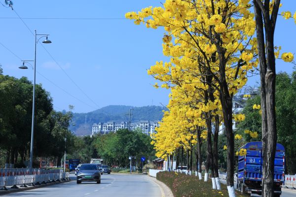 遠觀似黃金璀璨,近看如風(fēng)鈴搖曳。人間三月,在枝頭爭相怒放的黃花風(fēng)鈴木成為普洱街頭一道靚麗風(fēng)景,風(fēng)起花落間,輕輕地彈奏著春天的序曲。(郭春祥 攝)
