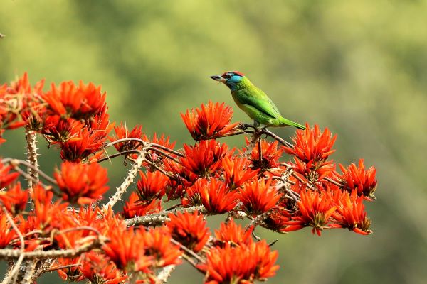 三月的景東,刺桐花開得茂盛,藍喉擬啄木鳥飛上枝頭吸食花蜜,勾勒出一個鳥語花香、萬物復(fù)蘇的春天。(許建新 攝)
