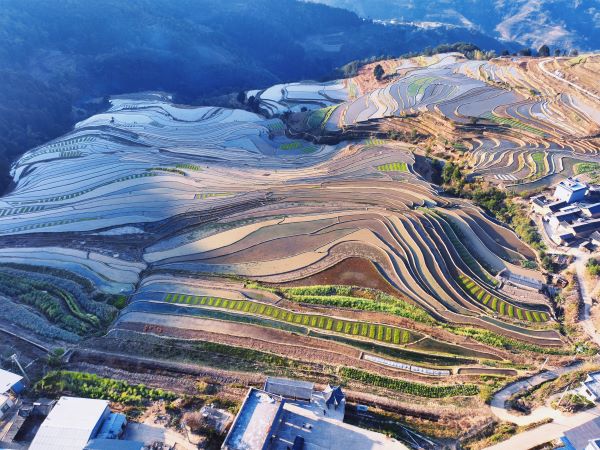 梯田染新綠,插秧正當(dāng)時。墨江縣克曼村的紫米梯田上,初春的晨光在層層疊疊的梯田上次第鋪展開,波光粼粼的水田,猶如條條銀絲帶在山野間閃爍。(楊攀 攝)