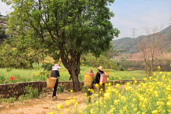 早春三月,浩浩蕩蕩的油菜花涌向江城大地,將開闊的原野染成一片金黃。田間勞作后歸家的人兒,在花海簇?fù)碇衅谂沃S收。(沈雷 攝)