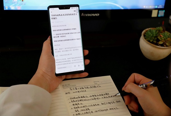 景東縣紀檢監察干部通過電視、電腦、報紙、雜志等平臺深入學習全國兩會精神,為更好監督執紀充電蓄能。圖為該縣年輕紀檢監察干部利用“學習強國”云南學習平臺摘抄學習習近平總書記的兩會金句。(羅曉清 攝)